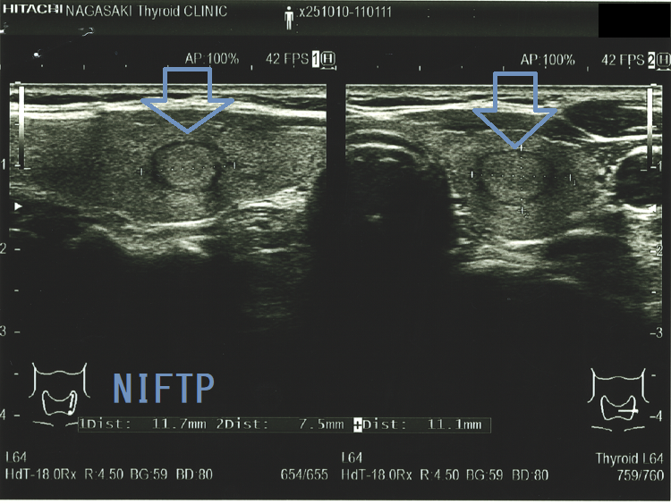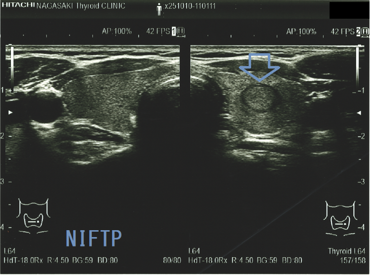 Non-invasive follicular thyroid neoplasm with papillary-like nuclear features (NIFTP) 超音波(エコー)画像;見かけは濾胞型甲状腺乳頭癌、 濾胞性腫瘍、腺腫様結節と鑑別できまない