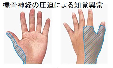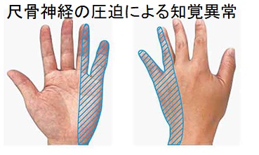 肘部管症候群(cubital tunnel syndrome)は、小指と薬指の感覚と筋肉を支配する尺骨(しゃっこつ)神経が、肘内側の肘部管で圧迫されて生じます。 小指と薬指尺側1/2のしびれと麻痺(尺骨神経麻痺:ulnar nerve palsy)がおこり、肘部管でのTinel 様徴候陽性。また、小指と薬指の深指屈筋、骨間筋、小指外転筋の筋力低下、さらに骨間筋の筋萎縮によるかぎ(鉤)爪変形(鷲手変形)を来します。
