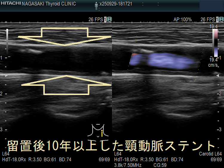 頸動脈ステントを留置した患者の甲状腺 超音波(エコー)画像;写真の頸動脈ステントを留置した患者は、甲状腺機能低下症/橋本病により動脈硬化が進行していました。(甲状腺と動脈硬化)