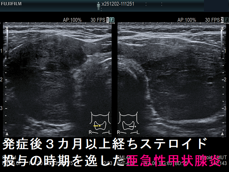 亜急性甲状腺炎には副腎皮質ホルモン剤(ステロイド剤)が劇的に効きます。たいてい服薬開始後2-3日で痛みも消え、熱も下がり、治ったような錯覚に陥ります。これにだまされ、服薬中止すれば(患者の自己判断・治療経験のない医者)、1週間以内に元の症状に戻り、最初から副腎皮質ホルモン剤(ステロイド剤)投与をやり直さねばなりません。最善の方法は、エコー所見が改善しているか確認しながら副腎皮質ホルモン剤(ステロイド剤)をゆっくり着実に減量するやり方です。(平均3-4か月は掛かります。)