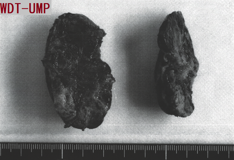 悪性度不明な高分化腫瘍(WDT-UMP);超音波(エコー)画像から判るように、良性濾胞腺腫よりも、腺腫様結節や濾胞型甲状腺乳頭癌に近い見え方です。