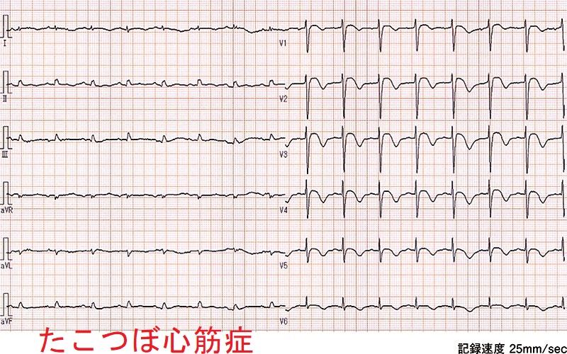 - 心エコーでは心尖部が無収縮・心基部が過収縮し、たこつぼ型心筋症に特徴的
