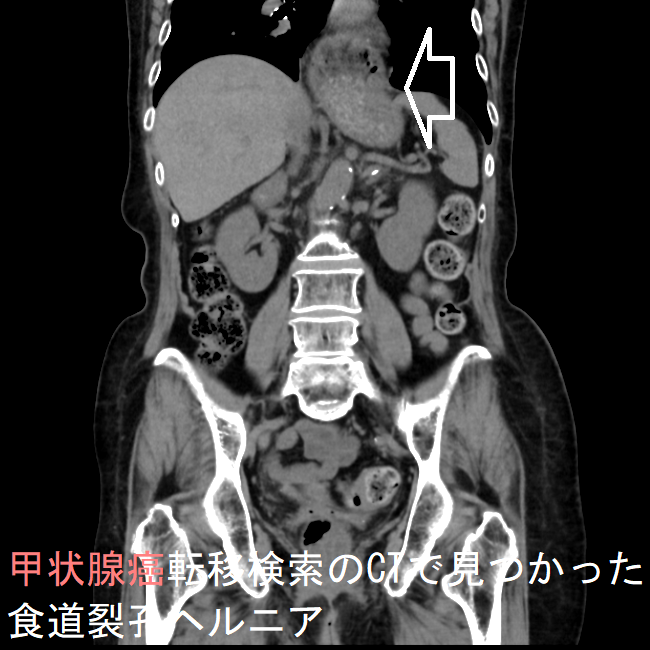 甲状腺癌転移検索のCTで見つかった 食道裂孔ヘルニア(冠状断)