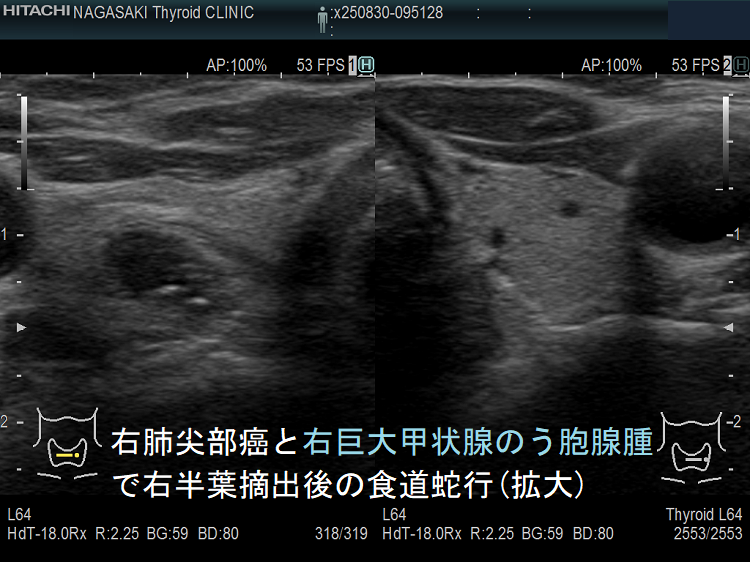 右甲状腺摘出後、左巨大腺腫様結節で右側に位置する食道