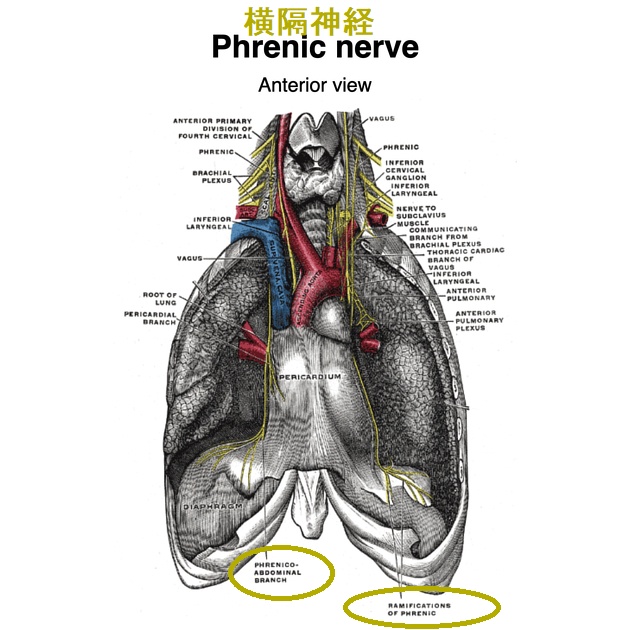 胸腺癌(悪性胸腺腫、浸潤性胸腺腫)は前胸部から肺門部まで浸潤し、横隔神経自体にも浸潤するため、摘出手術で横隔神経を損傷する可能性が高い(術後横隔神経麻痺)。術後横隔神経麻痺では、術後から息が深く吸えなくなります。内肋間筋・補助呼吸筋と代償性の呼吸数増加で補える場合が多いが、重症例は胸腔鏡下横隔膜縫縮術の適応。
